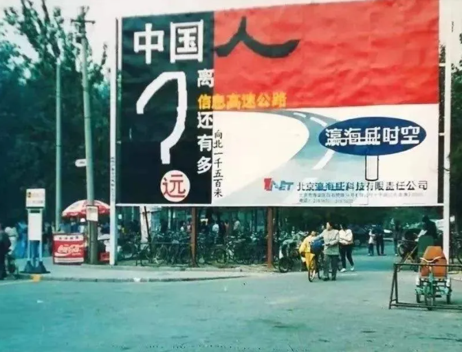 最后再說一個(gè)故事,當(dāng)年那些聰明人紛紛買了比爾蓋茨的《未來之路》,最后真的按照比爾說的“信息高速公路”去做的某個(gè)人,成立一家公司叫做瀛海威,它的廣告牌當(dāng)年極其具有感染力,如下圖: