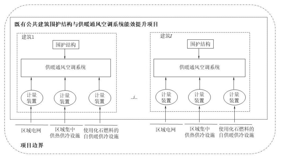 (2)項目邊界 既有公共建筑圍護結構與供暖通風空調系統(tǒng)能效提升項目邊界包括實施溫室氣體自愿減排項目涉及的單個或多個建筑的建筑圍護結構、供暖通風空調系統(tǒng)等,以及項目所在區(qū)域電網(wǎng)中所有發(fā)電設施、區(qū)域集中供暖設施、區(qū)域集中供冷設施、使用化石燃料的自供暖設施、使用化石燃料的自供冷設施。 《方法學》允許同一項目申報主體將位于同一省級行政區(qū)(省、自治區(qū)、直轄市)內的多棟公共建筑整合為一個項目進行開發(fā)與申報。