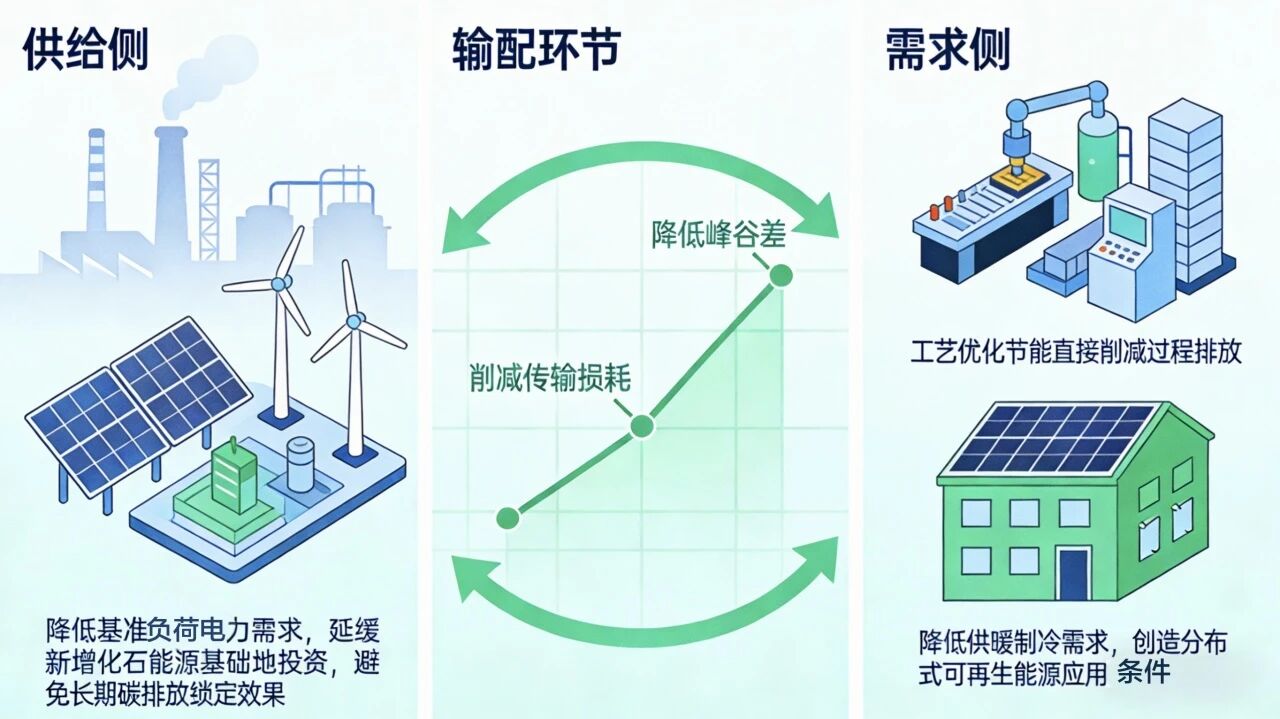 從全生命周期視角看,節(jié)能的碳減排效益貫穿能源系統(tǒng)各個(gè)環(huán)節(jié)。在供給側(cè),節(jié)能降低了基準(zhǔn)負(fù)荷電力需求,延緩了新建化石能源基礎(chǔ)設(shè)施的投資需求,避免了長(zhǎng)期碳排放鎖定效應(yīng);在輸配環(huán)節(jié),通過(guò)降低峰谷差和總用電量,削減電網(wǎng)傳輸損耗,從而降低單位電量碳排放強(qiáng)度;在需求側(cè),工業(yè)系統(tǒng)通過(guò)工藝優(yōu)化節(jié)能直接削減過(guò)程排放,建筑節(jié)能則不僅降低供暖制冷需求,還為分布式可再生能源的應(yīng)用創(chuàng)造了有利條件。