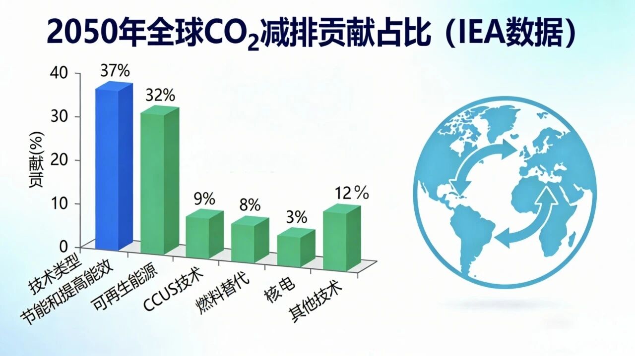 謝克昌院士最早于2022年11月在《什么是實(shí)現(xiàn)“碳達(dá)峰、碳中和”最直接、最有效、最經(jīng)濟(jì)的手段?》專題演講中明確指出:“相比拓展二氧化碳資源化利用途徑,節(jié)能提效才是實(shí)現(xiàn)碳達(dá)峰、碳中和的第一優(yōu)選。我國(guó)單位GDP能耗是世界平均水平的1.4-1.5倍(根據(jù)最新2024年數(shù)據(jù)為1.3倍),若達(dá)世界均值,年均可減排34億噸CO?,占2020年全國(guó)碳排放總量的三分之一。” 國(guó)際能源署的分析進(jìn)一步印證了節(jié)能的全局價(jià)值:如果全球溫室氣體排放從目前的330億噸下降到2050年的100億噸左右,則2050年前節(jié)能和提高能效對(duì)全球二氧化碳減排的貢獻(xiàn)為37%,發(fā)展可再生能源貢獻(xiàn)為32%,燃料替代貢獻(xiàn)為8%,發(fā)展核電貢獻(xiàn)為3%,CCUS技術(shù)貢獻(xiàn)為9%,還有12%貢獻(xiàn)由其他技術(shù)滿足。可見2050年之前,節(jié)能和提高能效,被視為全球能源系統(tǒng)二氧化碳減排的最主要途徑。