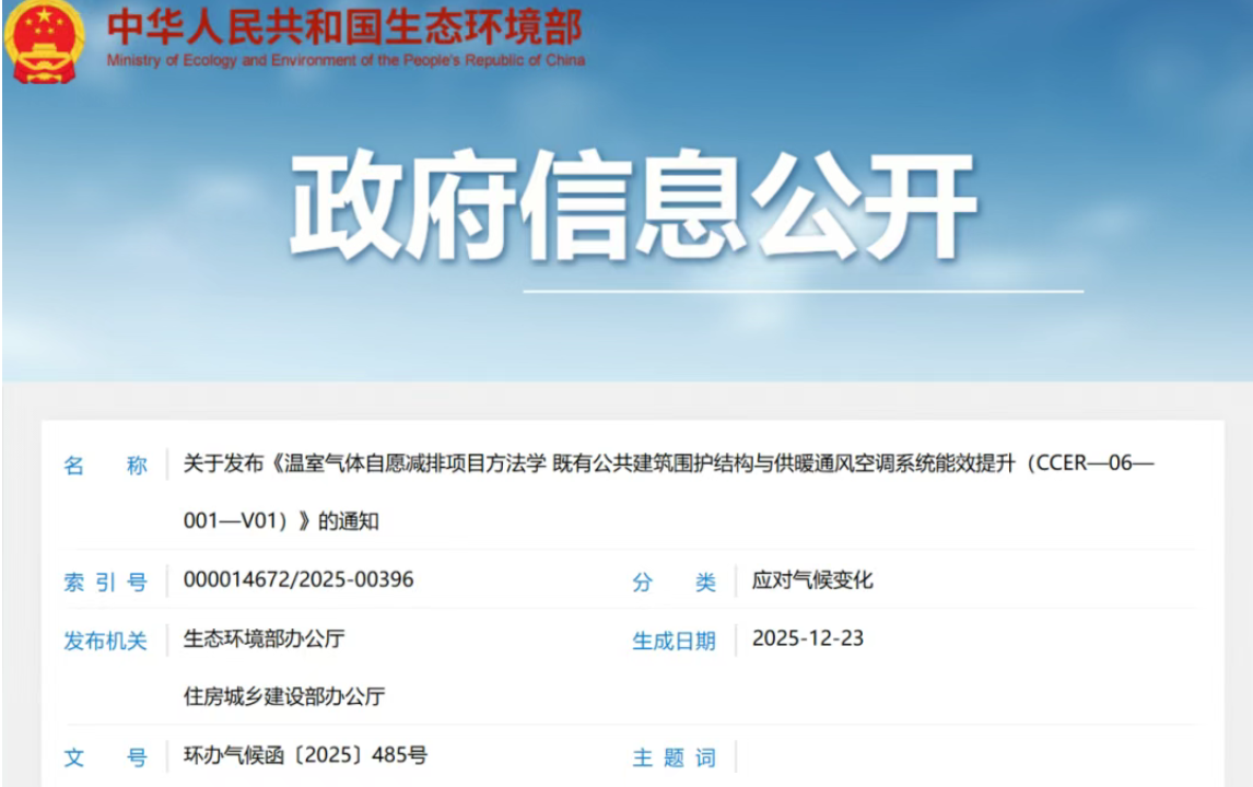 2025年12月生態環境部發布了建筑領域首個 CCER 方法學——《既有公共建筑圍護結構與供暖通風空調系統能效提升(CCER—06—001—V01)》
