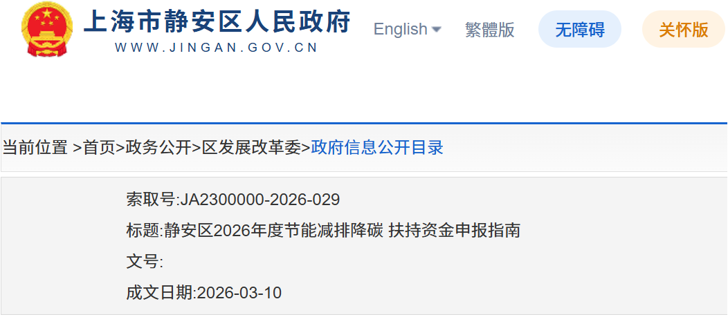 2026年3月上海市靜安區政府發布了《靜安區2026年度節能減排降碳扶持資金申報指南》(簡稱《指南》)。