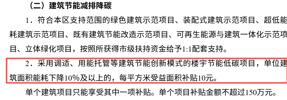 《指南》明確指出綠色建筑、超低能耗建筑、既有建筑節能改造等項目,按所獲市級扶持資金 1:1 配套支持;采用調適、用能托管等創新模式的樓宇節能低碳項目,單位建筑面積能耗下降10%及以上的,按10元/平方米受益面積給予補貼。
