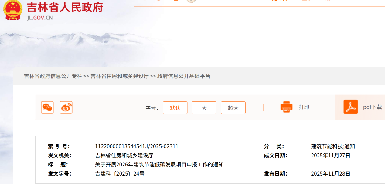 2025年11月吉林省發布2026年建筑節能低碳發展項目申報工作的通知。