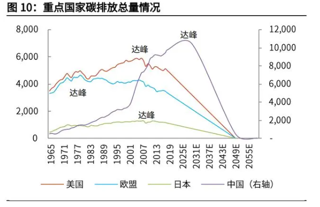 為什么“新冠疫情”后,我國推動“碳中和”更加迅速?——增加國際聲譽和話 語權。2019 年我國碳排放量達 98.26 億噸位列全球第一(人均碳排放和碳排放 量/GDP 均相對較低),自 2005 年以來為全球碳排放總量最高的國家(加入世 貿組織后,全球產業鏈分工變化所致)。近年來我國碳排放增速已有所放緩,但 較為龐大的人口基數使得我國碳排放全球占比仍在持續提升,2019 年達 28.76%。而針對“新冠疫情”源頭問題,經常有部分西方國家和人員因政治原因公開抹黑 中國。而加速推動“碳中和”將助力我國樹立負責任的大國形象,在國際氣候法 律秩序構建中爭取獲得“話語權”,并掌握未來全球“游戲規則”的主動權和制 定權。目前,全人類氣候目標競賽已經開啟,根據 EnergyClimate 機構推出的凈零排 放競賽計分卡,目前我國已處于第四梯隊,位列全球第 28 位。3)“碳中和”的統一性:全球難得的政策與利益一致點從全球來看,多數國家已更新 NDC(國家自主貢獻)目標。“碳中和”已成為 全球大趨勢。拜登上臺后,美國重新加入《巴黎協定》,應對氣候變化是拜登此次總統競選的 核心承諾之一,未來美國將在全球氣候變化、新能源發展方面采取更多的措施。雖然前期中美在貿易和技術層面有著種種的不愉快,但是在應對全球氣候變化方 面,無論是中美還是全球,在碳中和方面,具有相同的利益和方向。盡管全球越來越多的政府正在將碳中和目標納入國家戰略,但就具體目標而言, 仍有區別。如歐盟在 2020 年 3 月提交《氣候中性法》,旨在從法律層面確保歐洲到2050 年成為首個“氣候中性”大陸。美國加州和中國分別制定了 2045 年 和 2060 年“碳中和”目標。加州的目標包括削減所有溫室氣體排放,包括二氧 化碳、甲烷等,并抵消其無法削減的排放量,而中國的目標僅針對二氧化碳。我國碳排放下降斜率更大。由于發展階段的不同,發達國家已普遍經歷“碳達峰”, 為達到 2050 年“碳中和”,更大程度上只是延續以往的減排斜率。而我國碳排 放總量仍在增加,需要經歷 2030 年前“碳達峰”,然后走向 2060 年前“碳中 和”。從實現“碳中和”的年限來看,比發達國家時間更緊迫,碳排放下降的斜 率更大。