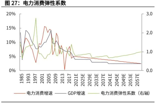 在“碳達峰”、“碳中和”目標的倒逼之下,“能耗指標”將成為重要的抓手, 2021 年全球經濟復蘇,大宗商品價格上漲動力較強,疊加“碳中和”目標下的 產能壓降手段,高能耗產品供給側約束后,價格有可能進一步提升。我們根據能耗指標,梳理了高耗能類型產品:電解鋁、硅鐵、電爐錳鐵、石墨電 極、燒堿、滌綸、銅等,都有可能成為限制對象。現有的能源系統中,煤、石油是主要力量。據統計年鑒數據,2019 年我國能源 消費總量 48.7 億噸標煤,其中煤炭、石油、天然氣、一次電力及其他能源占比 分別為 57.7%、18.9%、8.1%、15.3%。從用途來看,石油主要用于終端消費(交通、工業),煤炭主要用于中間消費(火 力發電),天然氣主要用于終端消費(交通、工業、建筑部門)。回顧人類對能源利用的探索歷程,實際上是從利用核外電子到利用核內電子的過 程,但這恰是宇宙、物質、能源發展的逆過程。二次能源中,對電能的利用是一項偉大的革命,現已成為能源利用的樞紐,從歷 史上看,“電”也引發了多次生產技術革命。而氫能同作為二次能源,具有可存 儲的優勢,但也因制備和使用效率稍遜而經濟性較差,但從能量循環的角度看, 可以有助于碳的減排。鋰、氫能同作為可行且具有前景電子存儲載體,其重要的原理特點在于,Li+與 H2 都是小粒子,有助于提升物質/能源轉換便利性。碳中和的最重要目的就是減少含碳溫室氣體的排放,采用合適的技術固碳,最終 達到平衡。為達到碳中和,我們預計到 2060 年,清潔電力將成為能源系統的配置中樞。供 給側以光伏+風電為主,輔以核電、水電、生物質發電;需求側全面電動化,并 輔以氫能。(1)我們采用“自上而下”的測算方法,假設未來 GDP 增速和發電量增速從“十 三五”末期的 5%逐步下降到 2.5%;而由于節能降耗的原因,未來單位 GDP 能 耗逐步下降,電力消費彈性系數將小于 1。(2)假設未來我國總發電量和 GDP 保持同步增長態勢且增速一致,假設 GDP 和總發電量增速分別為 2021-2030 年 4%、2031-2040 年 3%、2041-2060 年 2.5%。