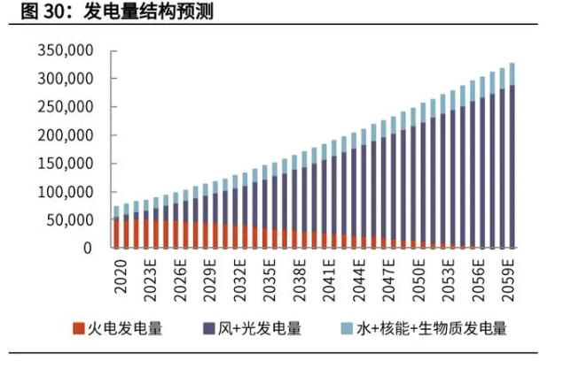 根據我們的上述假設,以 2019 年發電量 7.22 萬億千瓦時為基礎,2030 年發電 量達到 11.9 萬億千瓦時(和部分機構的預測數據基本一致),2060 年發電量進一步達到 32.71 萬億千瓦時。在總發電量預測的基礎上,我們將進一步對不同發電方式未來的發電量及相應的 裝機需求進行拆分。(1)火電:裝機量方面,在 2030 年碳達峰基礎上,在經濟發展的過程中 2020-2030 年仍需要有一定規模的火電裝機支撐發電量增長,因此我們假設火電 裝機在 2020-2030 年間每年仍將維持增長態勢,但增量逐步減少直至 2030 年無 新增火電裝機;2030-2060 年,火電裝機每年將逐步退出電力市場,直至 2060 年碳中和時存量火電裝機清零。利用小時數方面,隨著火電裝機的逐步減少,未 來火電將更多用于調峰平抑發電曲線,因此我們假設火電利用小時數從 2020 年 的 4080 小時逐步降低至 2030 年的 3080 小時,后續則保持平穩。發電量方面, 在裝機量和利用小時數假設的基礎上,火電的發電量占比將從 2020 年的 68%逐 步減少至 2060 年碳達峰時的 0%。(2)水+核能+生物質:假設未來水+核能+生物質整體的發電量情況保持穩定, 2020-2060 年,在 1.7 萬億千瓦時的基礎上每年增長 2%。(3)光伏+風電:在火電發電量逐步減少,水+核能+生物質發電量保持相對穩 健增長的背景下,光伏和風力發電將逐步成為未來最重要的發電方式。發電量占 比方面,我們假設光伏+風電發電量中光伏發電的占比維持在 40%;利用小時數 方面,假設風電、光伏年利用小時數分別維持在 2400h、1300h;裝機量方面, 在總發電量發展、其他發電方式發電量、光伏發電量占比、以及光伏和風電利用 小時數等預測的基礎上,我們測算得出2030年風電、光伏新增裝機量分別為1.53、 1.88 億千瓦,2060 年風電、光伏新增裝機量進一步達到為 2.19、2.7 億千瓦。(4)儲能:由于光伏、風電的不穩定性,必須輔以必要的儲能以平抑發電波動。假設儲能容配比從 2020 年的 10%逐步提升至 2060 年的 100%,備電時長從 2020 年的 2h 逐步提升至 2060 年的 4h,則儲能每年的新增容量將從 2020 年的 0.24 億千瓦時增長至 2060 年的 19.55 億千瓦時。需要注意的是,我們對光伏、風電新增裝機量的預測源自對部分關鍵變量的核心 假設,如果其未來發生變化(如火電利用小時降低超預期、水+核能+生物質發 電量降低、儲能配套設施建設超預期等),則未來光伏、風電每年的新增裝機量 或將超預期增長。