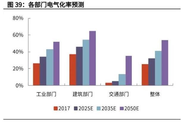 由于能源供給側向綠色電力轉變,所以需求側的脫碳首先意味著終端電氣化。根據國網能源研究院 2019 年 12 月的研究成果,終端電氣化率在 2050 年達到 50%以上,其中工業、建筑、交通部門分別達到 52%、65%、35%。