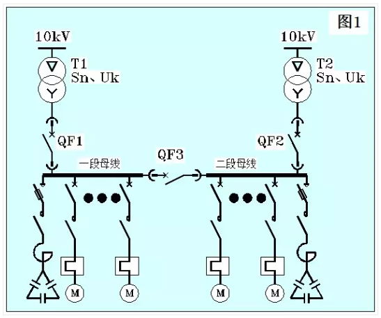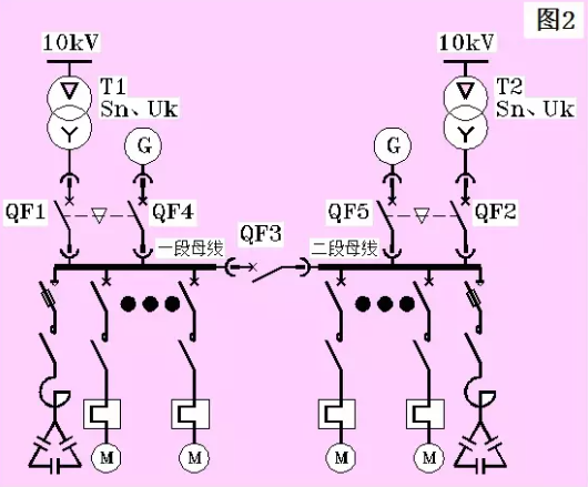 在這張圖中,我們看到了兩臺(tái)變壓器,分別標(biāo)記為T1和T2。在實(shí)際運(yùn)行中,兩段母線由各自的變壓器供電。于是,兩段進(jìn)線斷路器QF1和QF2均閉合,而單母線分段的母聯(lián)斷路器QF3打開;如果某段進(jìn)線的變壓器或者中壓側(cè)出現(xiàn)問題,例如出現(xiàn)嚴(yán)重電壓凹陷(欠壓或者失壓)或者故障,則該段進(jìn)線斷路器打開,然后閉合母聯(lián)斷路器QF3;當(dāng)系統(tǒng)恢復(fù)后,有兩種恢復(fù)方法:恢復(fù)方法1:將母聯(lián)斷路器QF3打開,再閉合對(duì)應(yīng)的進(jìn)線斷路器。這種方法簡(jiǎn)單,但母線上的負(fù)載例如電動(dòng)機(jī)在經(jīng)歷了一次停電重起動(dòng)后,需要再次經(jīng)歷停電重起動(dòng)。恢復(fù)方法2:先將對(duì)應(yīng)的進(jìn)線斷路器閉合,這時(shí)變壓器并列運(yùn)行,然后再將母聯(lián)斷路器打開。這種方法稍微復(fù)雜,但負(fù)載無須經(jīng)歷第二次停電重起動(dòng)。