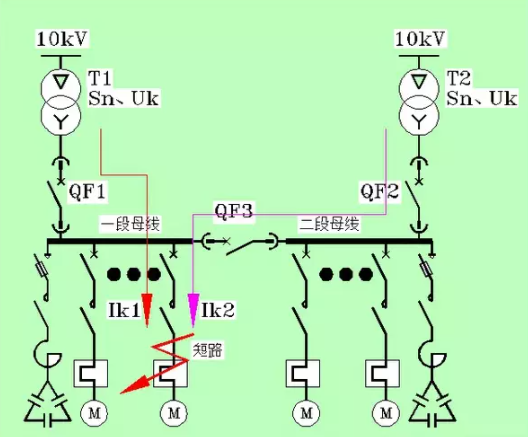 圖中兩進(jìn)線和母聯(lián)均閉合,變壓器T1和T2處于并列運(yùn)行狀態(tài)。當(dāng)一段母線的負(fù)載出現(xiàn)短路時(shí),兩臺(tái)變壓器均向短路點(diǎn)貢獻(xiàn)短路電流,因此負(fù)載處的短路電流等于單臺(tái)變壓器短路電流的兩倍。因此,變壓器并列運(yùn)行的條件是:各段母線上的饋電回路斷路器的分?jǐn)嗄芰Ρ仨殲檫M(jìn)線斷路器的兩倍。若沒有做到這一點(diǎn),則變壓器不允許并列運(yùn)行。