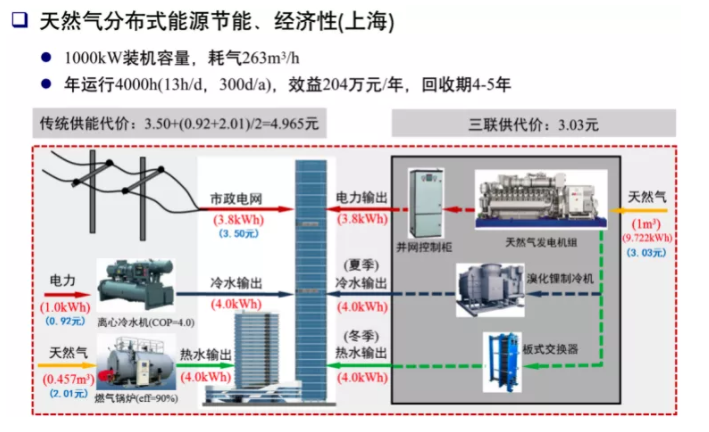 三聯(lián)供,1Nm3天然氣可發(fā)3.8kWh的電能,或差不多同等熱量或冷量。若天然氣能按3元/Nm3價(jià)格,折合三聯(lián)供系統(tǒng)發(fā)電成本就約等于市電價(jià)格0.78元/kWh(上海市的一般工商業(yè)峰谷電價(jià)的加權(quán)平衡價(jià)格約在0.75元/kWh左右),剩余的余熱可以制冷或供熱,這就成了項(xiàng)目比較確定的利潤;按0.7元/kWh的冷熱價(jià)格,280元/噸蒸汽的價(jià)格,經(jīng)濟(jì)效益是非常可觀的。