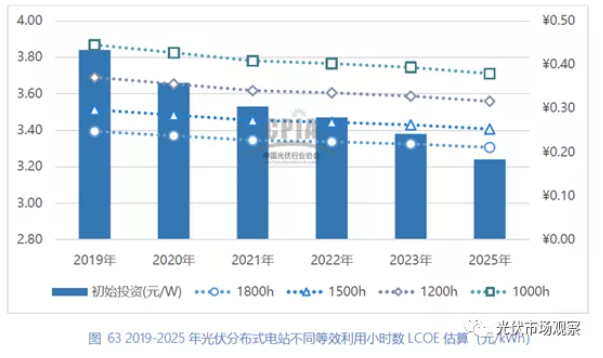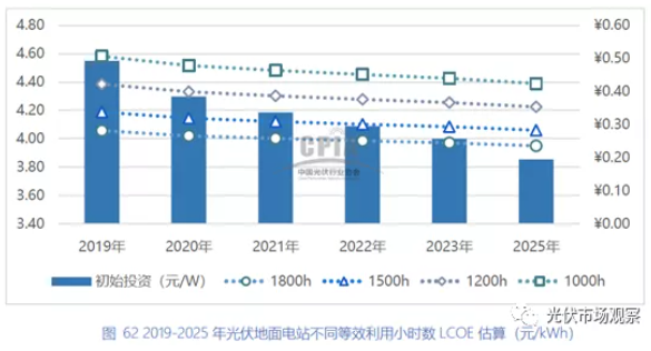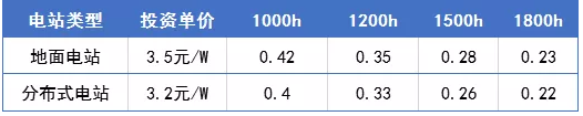 2.不同利用小時數度電成本測算 中國光伏行業協會《中國光伏產業發展路線圖》對不同利用小時數的度電成本進行了分析如下: 2019 年,全投資模型下地面光伏電站在1800h、1500h、1200h、1000h等效利用小時數的LCOE分別為0.28、0.34、0.42、0.51元/kWh。隨著組件、逆變器等關鍵設備的效率提升,雙面組件、跟蹤支架等的使用,運維能力提高,2021年后在大部分地區可實現與煤電基準價同價。