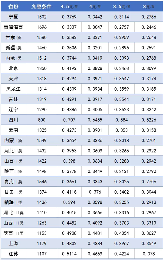 1.全國光伏度電成本測算 2019年,全國光伏的年均利用小時數為1169小時,光伏電站建設成本4.5元/W,此時度電成本為0.44元/度。【備注:全國脫硫燃煤電價平均值為:0.3624元/度。】 根據目前降本趨勢,預計2020年底光伏電站建設成本平均在3.5元/W左右,此時度電成本為0.36元/度。