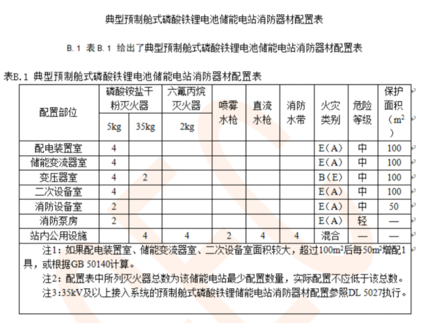 6、電池艙只能單層布置,相隔的間距不應小于3米,如果間距不滿足要求時,需要設置防火墻,兩端的輪廓各超出1米。同時可以理解為電池艙的布置與建構物不滿足距離要求時,也可以加防火墻,或將布置間隔不滿足要求的建筑物的相鄰外墻按照防火墻的等級進行建造;7、儲能電站須為獨立的區域,并設置圍欄,只有當電池艙的距離與圍欄距離不夠5米的時候,才需要將圍欄設置為圍墻;1、儲能電站應設置消防給水系統,水源的選擇與變電站的消防水源較為相似,如果設置在火力發電廠或新能源電站內的儲能系統,可以與其共用一個消防系統,滿足水壓、水量及滅火時間的要求;2、水量的計算時,要考慮消防栓3小時與預制艙內水噴霧1小時的水量需求之和。3、消防栓的設置的間距且要滿足4支消防水栓同時使用時的消防水流量小于20L/s;4、自動滅火裝置是針對預制艙(儲能設備)廠家提出的技術要求,需要配置細水霧滅火系統與氣體(一般為六氟丙烷)滅火裝置,在招標及技術協議中,可直接將4.8條款的要求附上。1、預制艙內的火災自動報警裝置及聯動裝置應與電站的其他區域分開;當火災自動報警系統設置在二次設備艙時,消防控制設備區域應與其他區域分開布置;2、預制艙內應設置可燃氣體、感煙、感溫探頭,且分別設置不少于2個;3、火災自動報警裝置及聯動裝置的告警及動作邏輯應按照4.9.5、4.9.6、4.9.7之條款要求;1、預制艙式儲能電站消防供電設計應符合一級消防供電的要求:一級消防負荷應由兩個獨立電源供電。所謂獨立電源,任一電源發生故障或停止供電時,其他電源將能保證繼續供電;3、儲能電站布置在室外時,按照規程規范要求,需設置獨立避雷針防直擊雷;接地裝置除滿足正常要求之外,可以與原有廠、場、站的接電網可靠連接,以降低接地電阻;對于地下嚴重腐蝕區域,可采用銅材接地或采用陰極保護;1、預制艙式磷酸鐵鋰電池儲能電站配置消防器材類型、數量及區域的要求見下表: