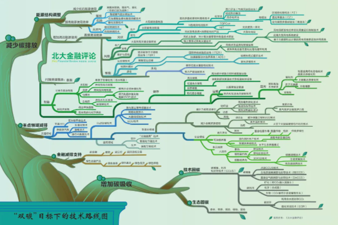 近日,《北大金融評論》發(fā)布“雙碳”目標(biāo)下的技術(shù)路線圖,包括減少碳排放和增加碳吸收2條主路線。其中,減少碳排放包括能源結(jié)構(gòu)調(diào)整、重點領(lǐng)域減排和金融減排支持3條路線,增加碳吸收又包括技術(shù)固碳和生態(tài)固碳2條路線。如此逐級細化,得到完整技術(shù)路線圖(該圖不代表本公眾號觀點)。
