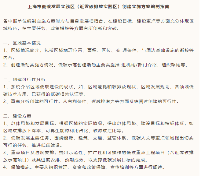 由各區(qū)政府和相關市級園區(qū)管委會(開發(fā)公司)作為申報主體,提出創(chuàng)建申請。商務區(qū)、郊區(qū)新城、城鎮(zhèn)、園區(qū)等各類區(qū)域均可申報,鼓勵條件較好的區(qū)域申報近零碳排放實踐區(qū)創(chuàng)建。