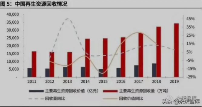 再生資源回收能力、利用效率則體現(xiàn)了我國(guó)循環(huán)經(jīng)濟(jì)發(fā)展的水平。2019 年可再生資源回收量達(dá)到 3.45 億噸,同比增長(zhǎng) 7.1%,比 2011 年已經(jīng)翻倍。根據(jù)中國(guó)再生資源回收利用協(xié)會(huì)數(shù)據(jù),在我國(guó) 2021-2035 年 GDP 年均增速 5.5%的情景假設(shè)下,得出可再生資源回收量將以 6.55%的年均增速提高,從 2019 年的 3.45 億噸提升至 2035 年的 8.08 億噸。