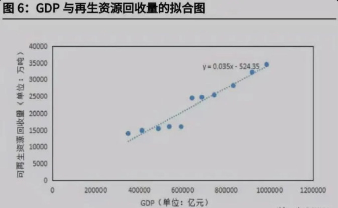 我國(guó)經(jīng)濟(jì)發(fā)展與資源回收利用量之間高度相關(guān)。根據(jù)商務(wù)部流通業(yè)發(fā)展司發(fā)布的 《中國(guó)再生資源回收行業(yè)發(fā)展報(bào)告》和再生資源信息網(wǎng)的統(tǒng)計(jì),2011-2018 年我 國(guó)主要再生回收價(jià)值從 5764 億元上升到 8705 億元,年均增長(zhǎng)突破 6%;從總量上看,制造業(yè)、消費(fèi)體量是 GDP 核心包含要素,這也恰恰是再生資源品的重 要來(lái)源。