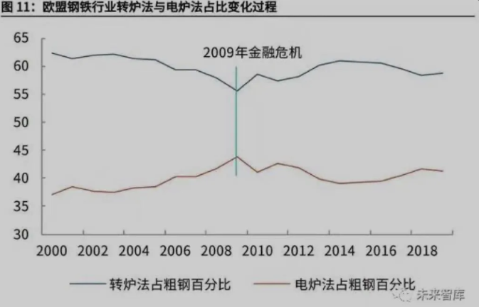 2005-2009 年,歐盟碳市場(chǎng)啟動(dòng)后,受到減排預(yù)期影響,電爐比例增加;2009 年金融危機(jī)后,歐盟鋼鐵行業(yè)轉(zhuǎn)爐法和電爐法的比例變化趨勢(shì)發(fā)生逆轉(zhuǎn);背后的 原因可能在于金融危機(jī)后政府的進(jìn)一步扶持下,鋼鐵行業(yè)低碳轉(zhuǎn)型約束減小,這 也側(cè)面體現(xiàn)了碳中和政策實(shí)際是受經(jīng)濟(jì)景氣度影響的。