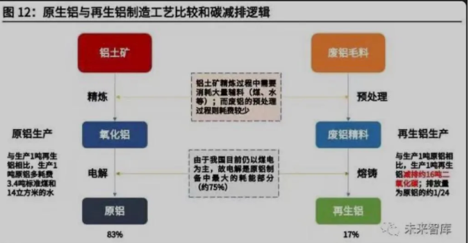取減排效率 16 tCO2e/t 和再生鋁產(chǎn)量 700 萬(wàn)噸計(jì)算,生產(chǎn)再生鋁代替原鋁可減 少 1.12 億噸 CO2e 排放。