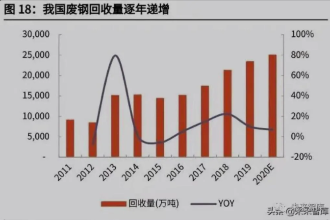 碳達(dá)峰、碳中和提出后,電爐(如果使用清潔能源)具有一定的減排效果,路線 低碳化轉(zhuǎn)變的過程中,會(huì)提升廢鋼的需求。