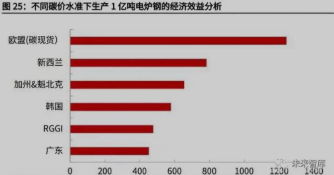 根據(jù)假設(shè),我們測(cè)算出在使用光伏/風(fēng)力提供電力的情境下,生產(chǎn) 1 億噸電爐鋼 的減排量為 2.55 億噸 C02。假設(shè)碳價(jià)為 100 元/噸,帶來(lái)的經(jīng)濟(jì)效益為 100*2.55+ (3000-2500)*0.7*1=605 億元;在歐盟碳現(xiàn)貨市場(chǎng)的碳價(jià)水準(zhǔn)下,電爐鋼的 減碳的經(jīng)濟(jì)效益將突破 1200 億元人民幣;即使取折中的韓國(guó)碳價(jià)水準(zhǔn),經(jīng)濟(jì)效 益也能達(dá)到約 580 億元人民幣。