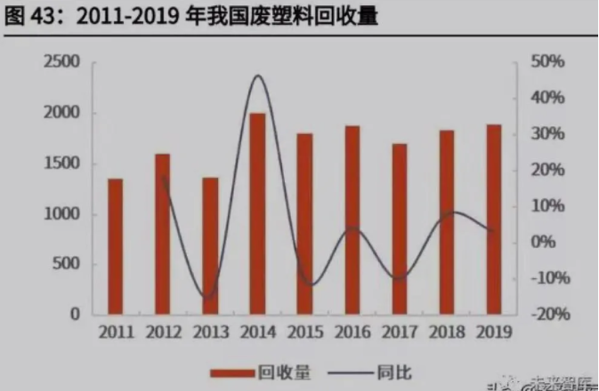 從循環(huán)再生階段來(lái)看,傳統(tǒng)產(chǎn)業(yè)鏈的再生廠商只是對(duì)廢塑料進(jìn)行簡(jiǎn)單物理回收, 無(wú)法得到用于食物和醫(yī)療等高質(zhì)量領(lǐng)域的再生塑料。但禁止進(jìn)口洋垃圾后,巨大 的供需缺口也促使提高我國(guó)回收技術(shù),增加化學(xué)回收,生產(chǎn)高質(zhì)量塑料,提高了 廢塑料的利用率。
