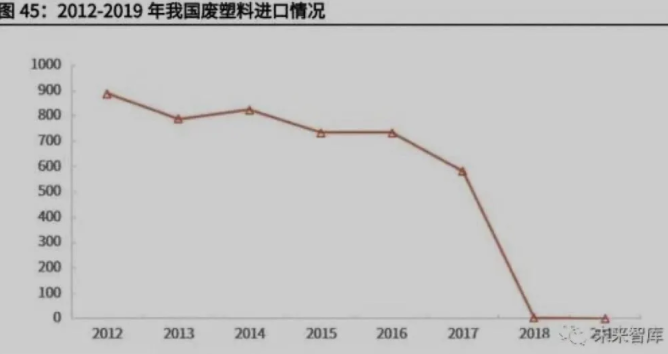 “限廢令”政策對(duì)我國(guó)廢塑料進(jìn)口產(chǎn)生較大沖擊。2018 年前,我國(guó)廢塑料進(jìn)口 量雖然逐年有下降,但進(jìn)口量仍保持在 500 萬(wàn)噸以上,2017 年“禁止洋垃圾進(jìn) 口”政策出臺(tái)后,2018 我國(guó)廢塑料的進(jìn)口數(shù)量?jī)H為 5 萬(wàn)噸,同比下降 99.1%, 2019 年進(jìn)口總量幾乎可忽略,同比下降 100%。