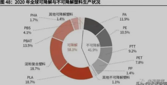 目前可降解塑料中占比前三的是淀粉復(fù)合塑料、PLA 和 PBAT,其中淀粉屬于天 然材料,性能缺陷很大,使用范圍非常受限,難以大規(guī)模應(yīng)用,而 PLA 具有獨(dú) 特的硬度與透明度性能,PBAT 在軟質(zhì)材料中最具成本優(yōu)勢(shì),這兩種材料將成為 未來(lái)可降解塑料中成長(zhǎng)最快的品種。