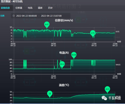 如上圖所示,通過平臺可以看到目前2號空壓機的設備信息,在4月22日0點到15點07分的運行狀態,可以看到包括設備信息、位移量、電流、溫度以及歷史的數據等。