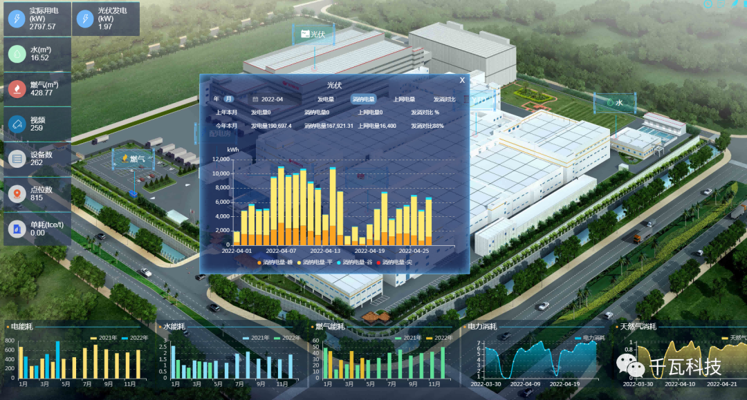 除了設備和環境,能源是生產的生命線,上圖就是對整個工廠的綜合能源監控,包括了水、電、氣、熱四種能源。不同于傳統只做單一電或某種能源的公司,我們可以在一個平臺內管理電、水、氣、熱等各種傳統能源,也可以管理光伏、儲能等新能源。