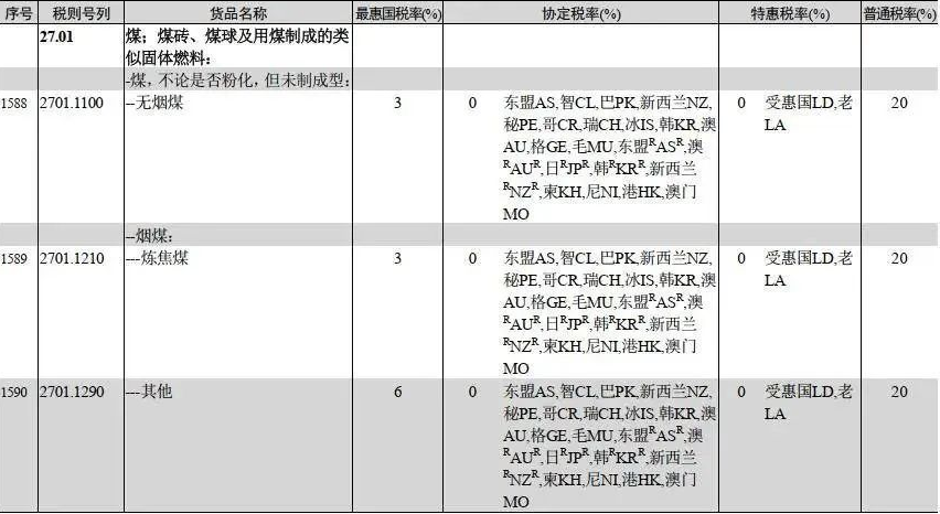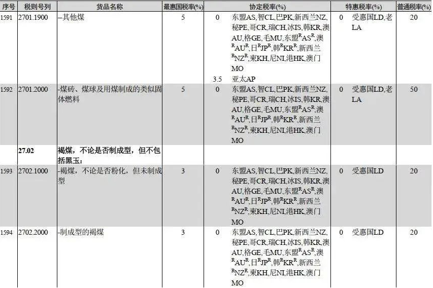 按照自貿協定,來自澳大利亞、印尼的進口煤適用的是協定稅率,均為0;來自包括俄羅斯、美國、南非、蒙古等在內的其他國家的進口煤實行最惠國稅率。
