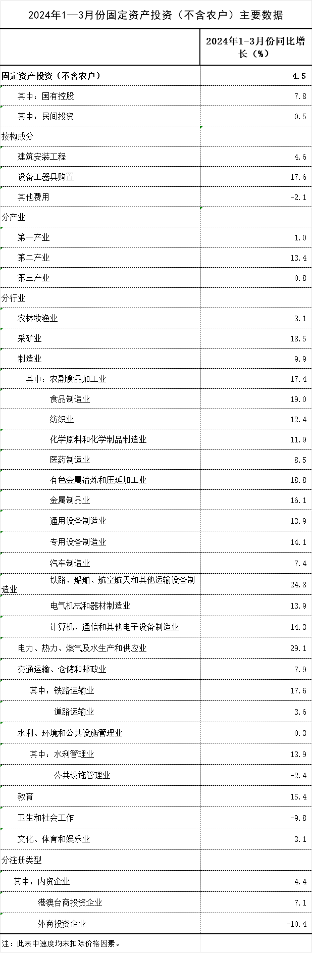 2024年1—3月份,全國固定資產投資(不含農戶)100042億元,同比增長4.5%(按可比口徑計算,詳見附注7),增速比1—2月份加快0.3個百分點。其中,制造業投資增長9.9%,增速加快0.5個百分點;基礎設施投資(不含電力、熱力、燃氣及水生產和供應業)增長6.5%,增速加快0.2個百分點。從環比看,3月份固定資產投資(不含農戶)增長0.14%。2024年1—3月份,民間固定資產投資51597億元,同比增長0.5%。