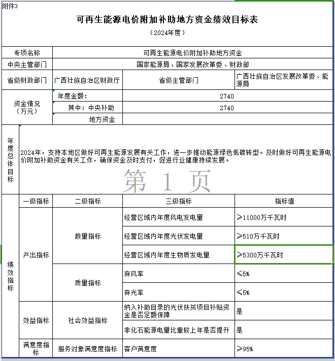 二、資金支付方式按照財(cái)政國(guó)庫(kù)集中支付有關(guān)制度執(zhí)行,具體金額見(jiàn)附件2。項(xiàng)目代碼和名稱為“10000017Z175060070001可再生能源電價(jià)附加補(bǔ)助地方資金”,收入列2024年政府性基金預(yù)算收入科目“1100407節(jié)能環(huán)保”,支出列2024年政府性基金預(yù)算支出功能分類(lèi)科目:“2116001風(fēng)力發(fā)電補(bǔ)助”、“2116002太陽(yáng)能發(fā)電補(bǔ)助”、“2116003生物質(zhì)能發(fā)電補(bǔ)助”,支出列2024年政府預(yù)算支出經(jīng)濟(jì)分類(lèi)科目“50799其他對(duì)企業(yè)補(bǔ)助”。