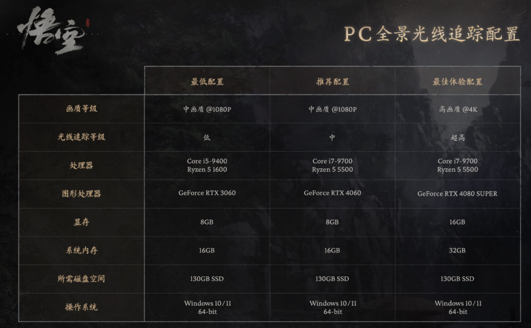 從官方給出的配置需求來看,《黑神話:悟空》對處理器和內存的要求并不高。但是,如果你想在游戲中享受視覺盛宴,那就得升級裝備了,尤其是顯卡。畫質高不高,光追滿不滿,直接決定了你玩的是“天命人”,還是“吉吉國王”。不過考慮到不是所有玩家都能使用最佳體驗的配置,我們這里選擇官方推薦配置:(中畫質1080p 中光追):處理器 i7-9700/Ryzen 5 5500;顯卡RTX 4060(8GB顯存);內存16GB;130GB固態硬盤空間。