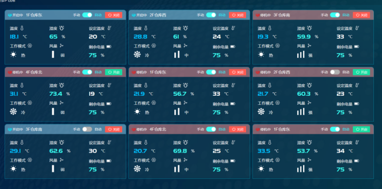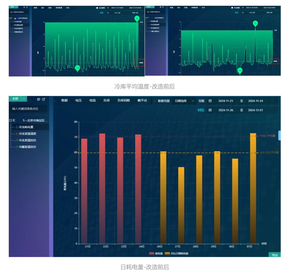 針對酒店餐廳的冷庫,使用AI智能調控程序調節冷庫溫度,達到節能效果。冷庫空調、風機接入溫控儀,可遠程控制啟停、制冷、化霜。