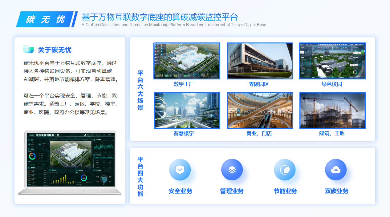 千瓦碳無憂平臺涵蓋六大場景、四大業務,根據需求為客戶提供定制化解決方案,做您節能降碳、綠色轉型路上最可靠的伙伴!